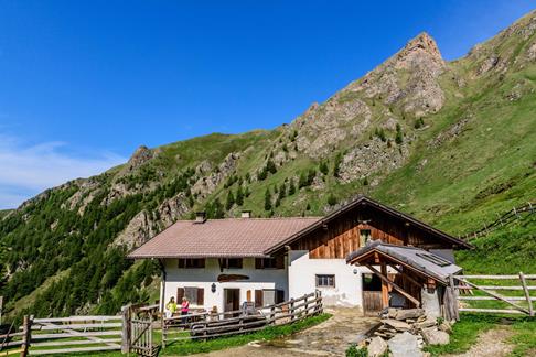 La malga Simile Mahd è situata ai piedi delle montagne lungo l'Alta Via di Fundres.