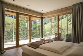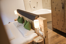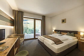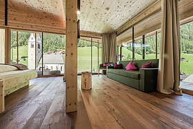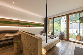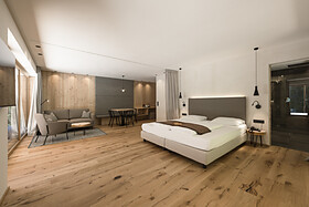 La nostra nuova Family Suite per 4-5 persone (ca. 45m²) con balcone vista Valle, in stile alpino moderno, offre due stanze separate e un bagno spazioso dotato di ampia doccia, WC, bidet, asciugacapelli. La camera è dotata di pavimente in legno, offre l’utilizzo gratuito del WiFi, 2 tv (43") a schermo piatto, cassaforte, scrivania e un divano utilizzabile, su richiesta, come possibile doppio letto aggiuntivo. Una borsa wellness con morbidi asciugamani per sauna e piscina sono a sua disposizione in camera.
